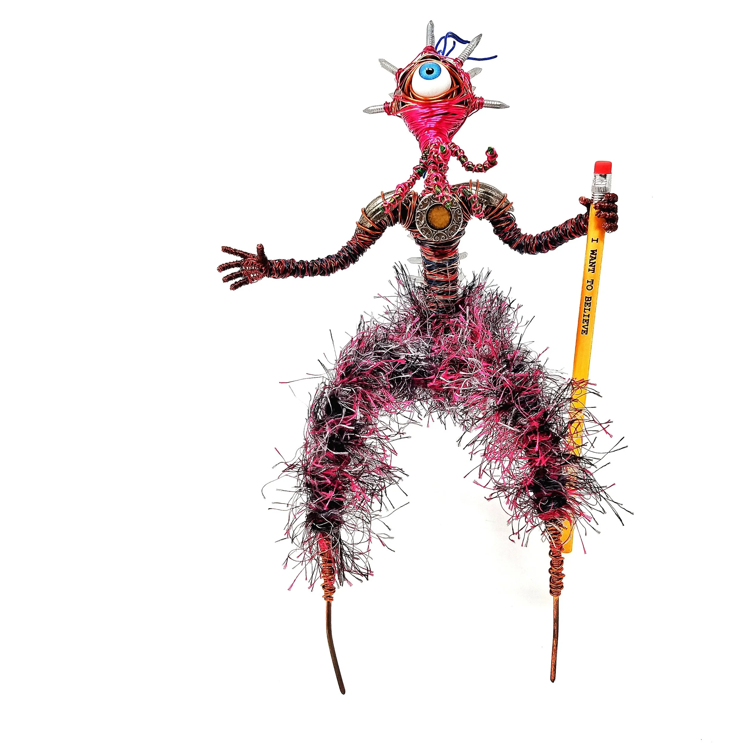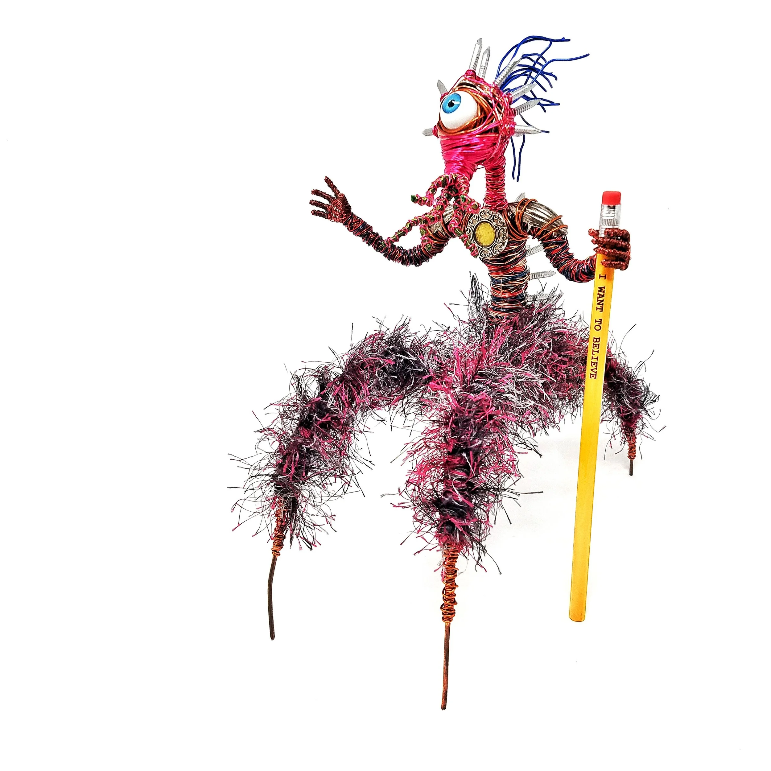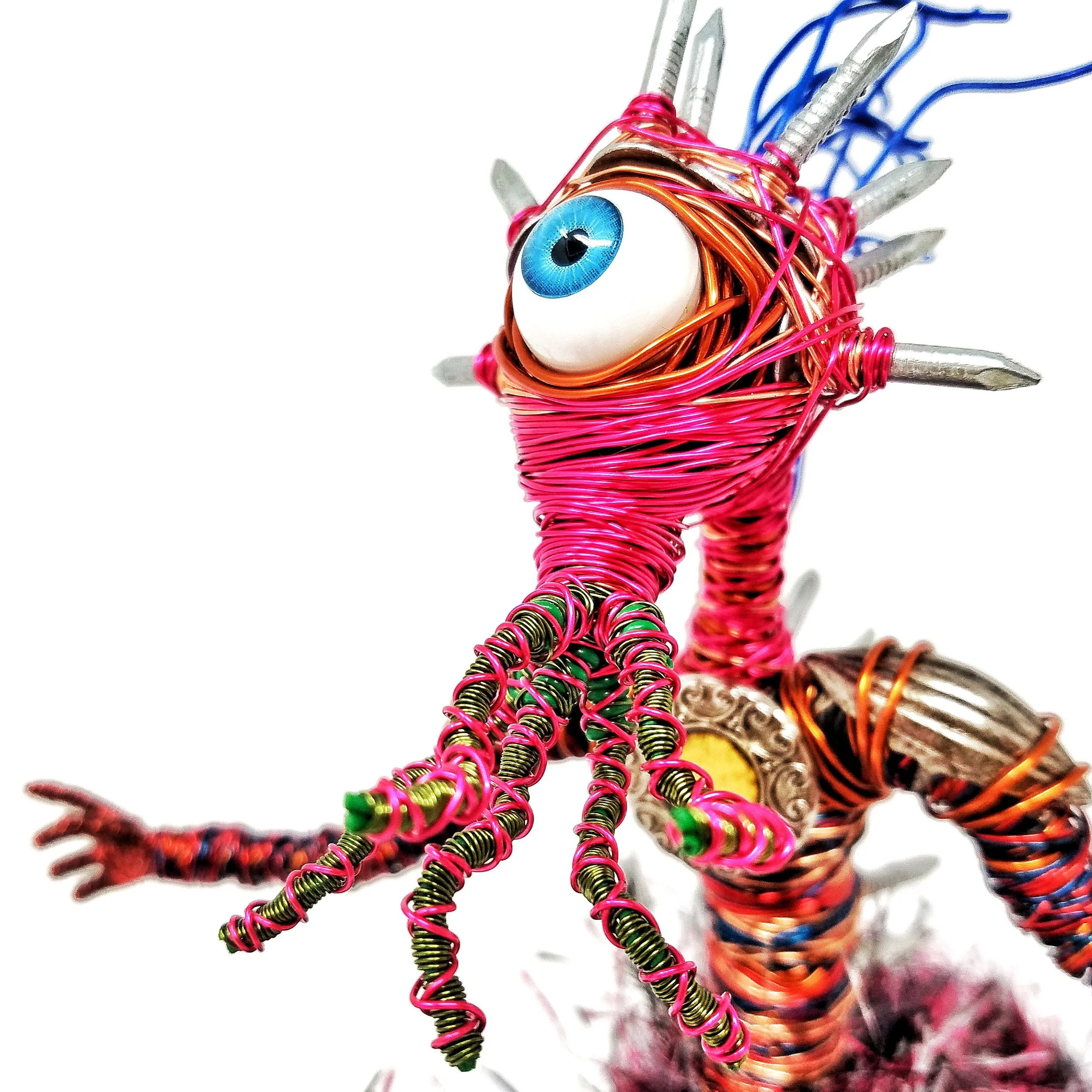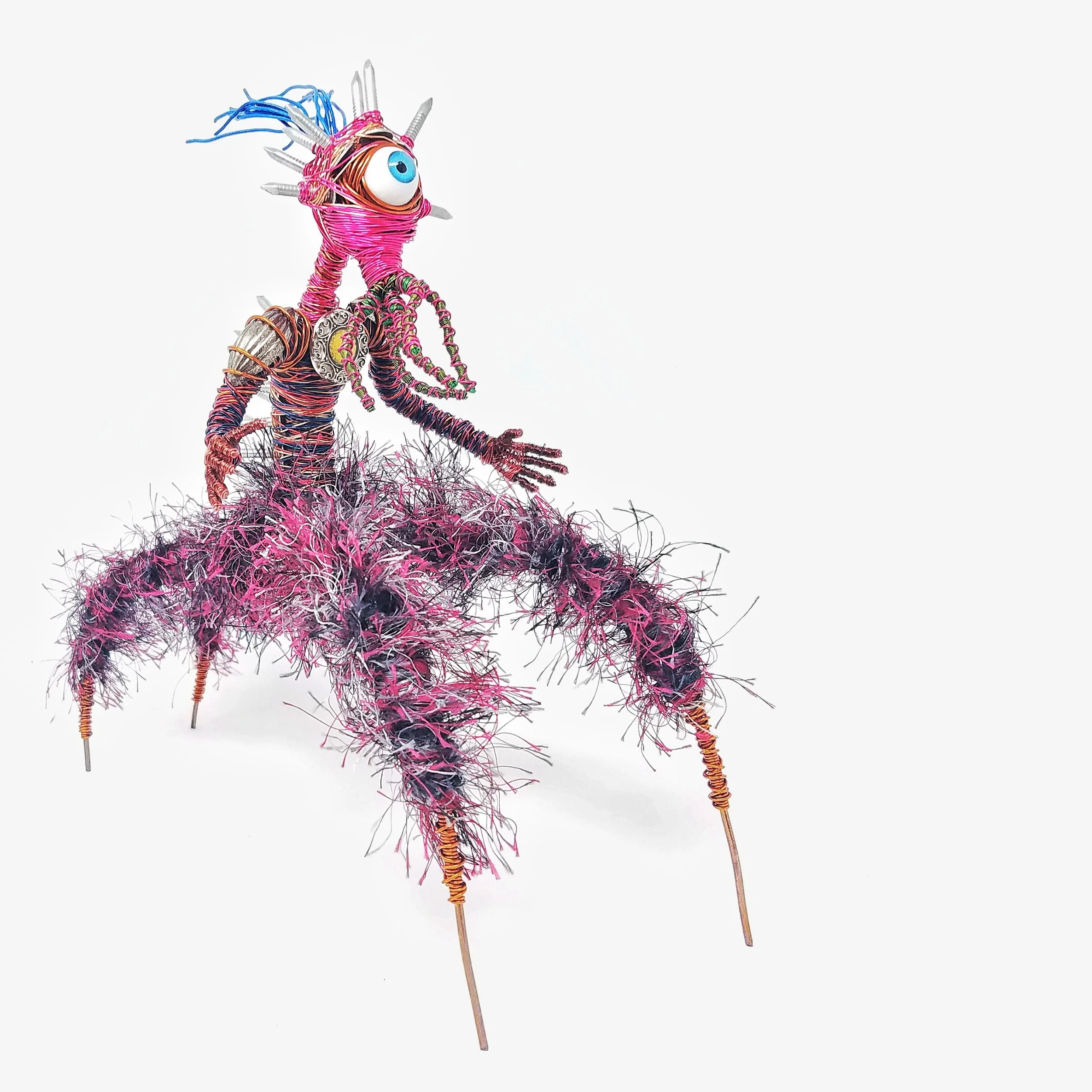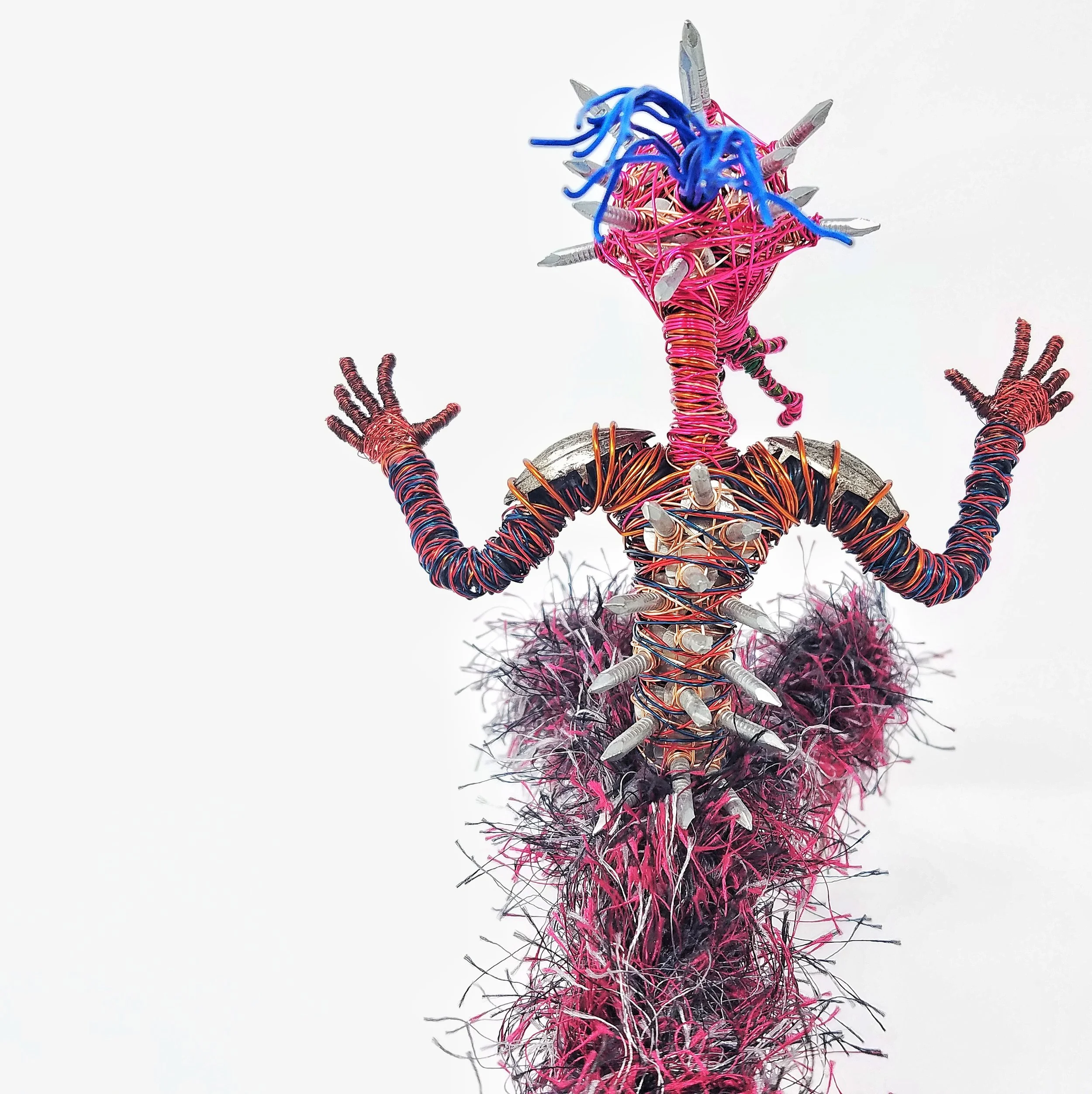 Sculpted out of mostly copper wire, nails, fancy yarn, and patience.